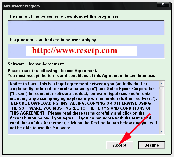3. Run AdjProg.exe program under Windows XP or under Windows 7 or Vista IN XP Compatibility mode. Press ACCEPT.