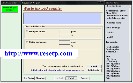 How to reset waste ink counter by adjustment service program ( for example R290 model).